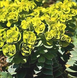 Liggende stengels met sierlijk stevig blauw-grijs blad in kransen rondom de stengel.